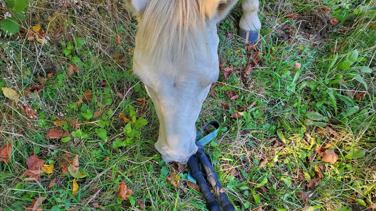 Avant de rentrer à la maison, et puisque je passe devant, une petite visite à Shiloh qui n'en a rien à faire tandis que son copain Atchoum bouffe mes bâtons, le coquin!