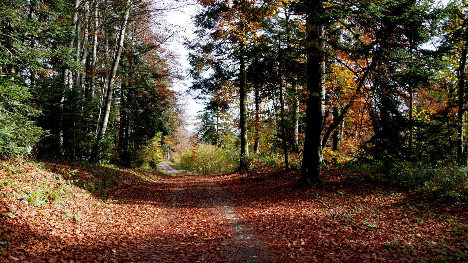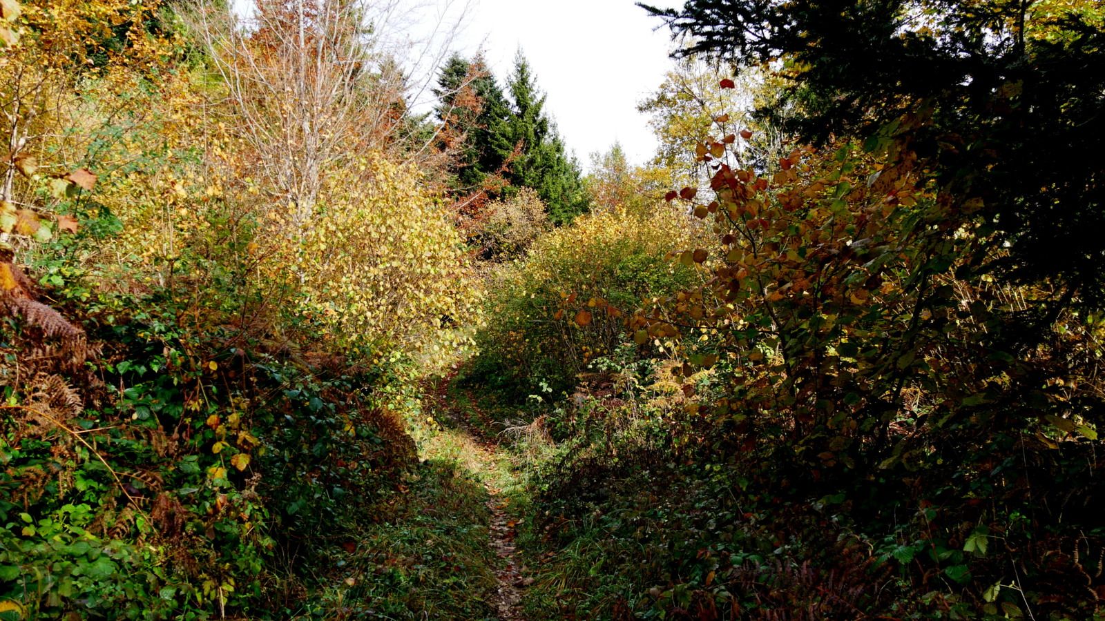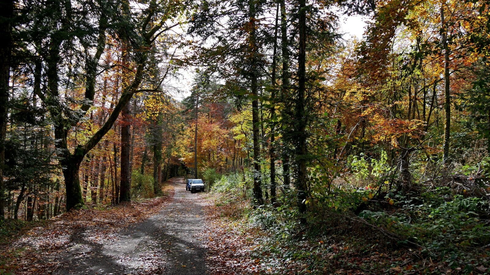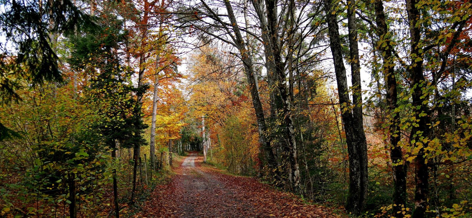 C'était un joli chemin aux arbres colorés. J'y ai rencontré le grand méchant loup... Euh, non! quelques forestiers au travail, à moins que ce ne soient des chasseurs !