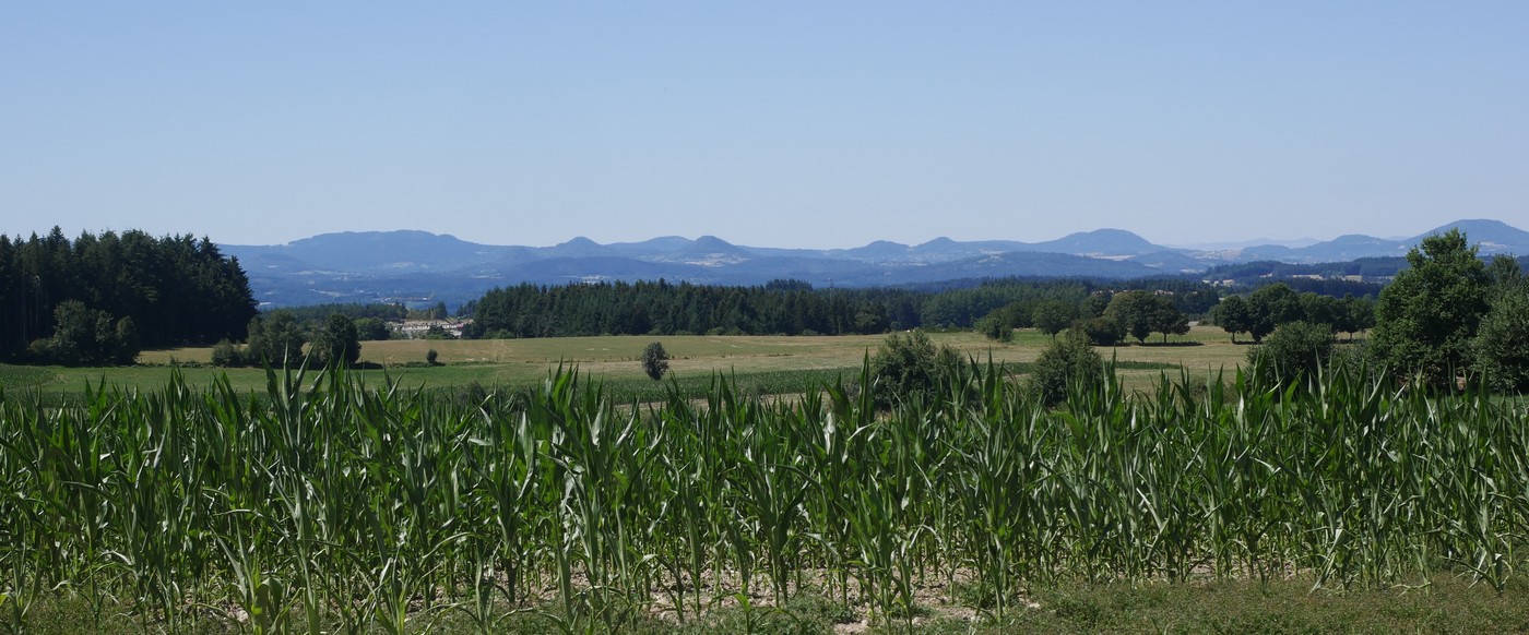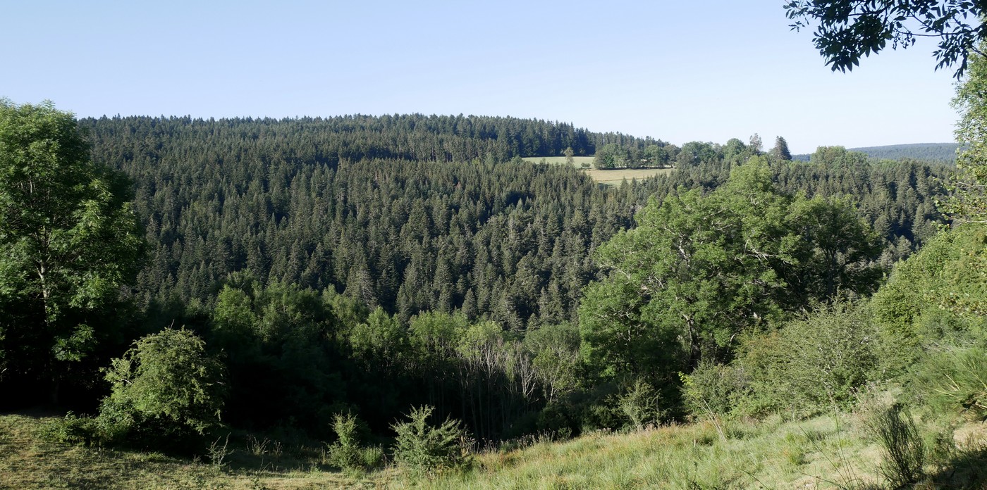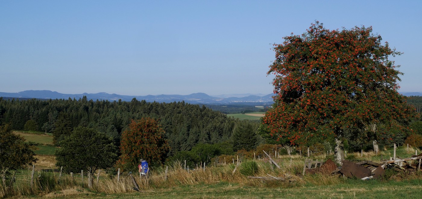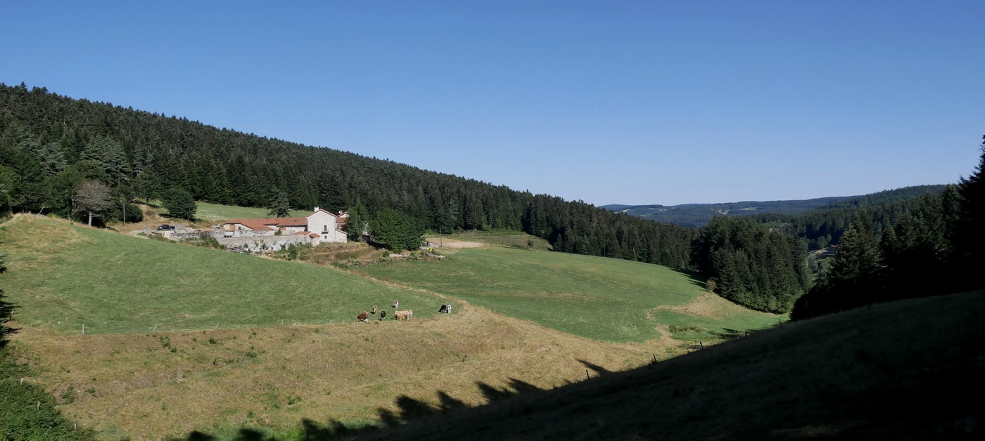 rejoindre un paysage ouvert d'où on peut admirer le mont Mézenc, le mont Alambre, le pic de Lizieux et le massif du Meygal.